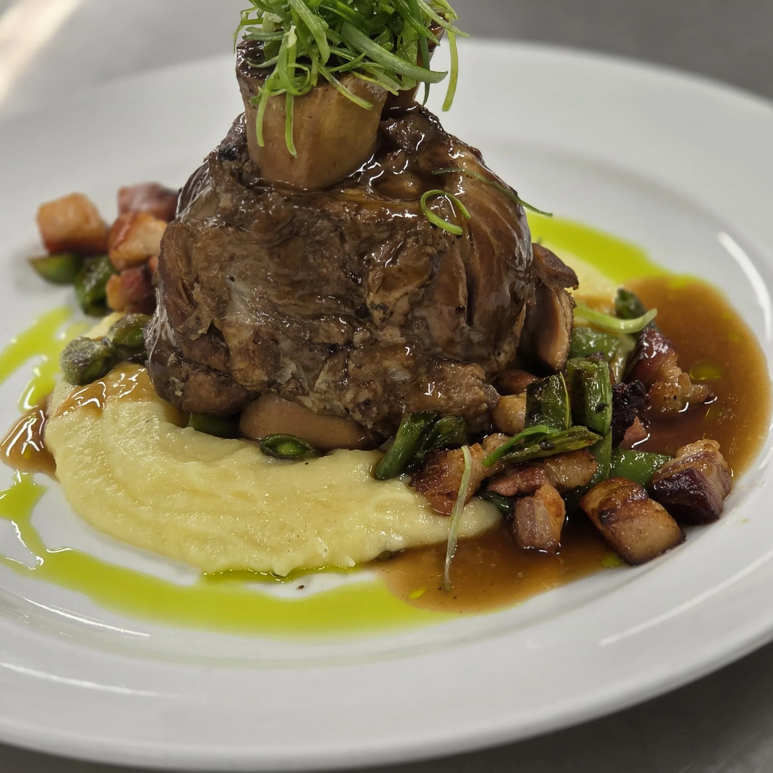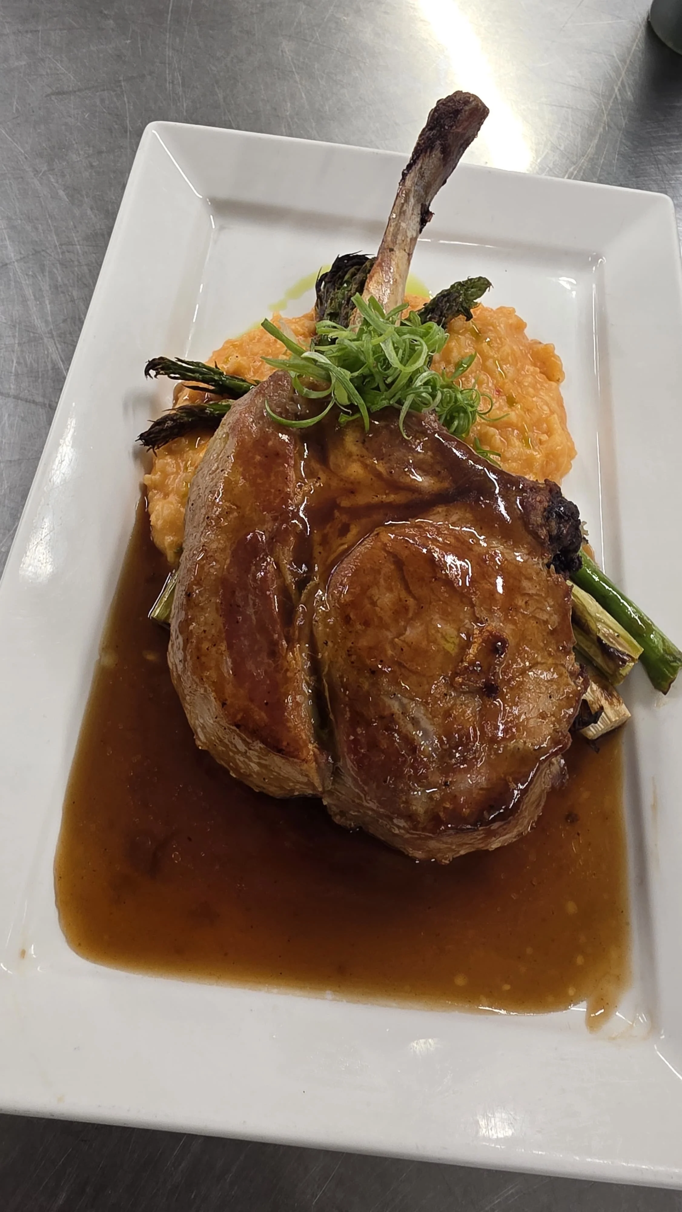 SPRING MENU SPRING MENU $8 cup $11 bowl Carrot Ginger Soup herb croutons, micro greens without croutons $8 cup $11 bowl $19 Red Pear & Endive Salad organic arugula, baby radicchio, candied walnuts, Danish blue cheese, sesame citrus honey vinaigrette $19 $41 Braised Pork Shank truffle whipped potatoes, sautéed sugar snaps with bacon lardons, natural sauce $41 $46 18 oz Tomahawk Pork Chop sundried risotto, roasted asparagus, bordelaise sauce $46 $49 Pan-Roasted Wild Halibut taro root puree, sautéed baby bok choy, smoked tomato beurre blanc $49 $14 Carrot Tiramisu fresh berries, anglaise sauce & raspberry coulis $14 CARROT GINGER SOUP BRAISED PORK SHANK PAN-ROASTED WILD HALIBUT RED PEAR & ENDIVE SALAD 18 oz TOMAHAWK PORK CHOP